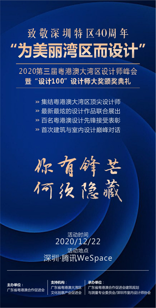 “設(shè)計100”粵港澳大灣區(qū)設(shè)計大獎是設(shè)計界獻禮粵港澳大灣區(qū)、深圳經(jīng)濟特區(qū)成立40周年的核心獎項,由廣東省粵港澳合作促進會主辦,廣東省粵港澳合作促進會建筑規(guī)劃與測量專業(yè)委員會和深圳市室內(nèi)設(shè)計師協(xié)會等單位共同承辦。旨在表彰一批實力過硬、成就卓越的設(shè)計師和設(shè)計機構(gòu),發(fā)掘設(shè)計新生代,塑造挖掘大中華區(qū)出色的設(shè)計師個人品牌。
